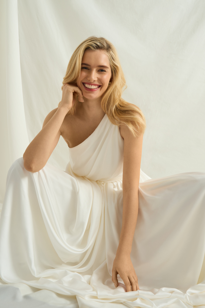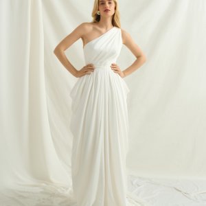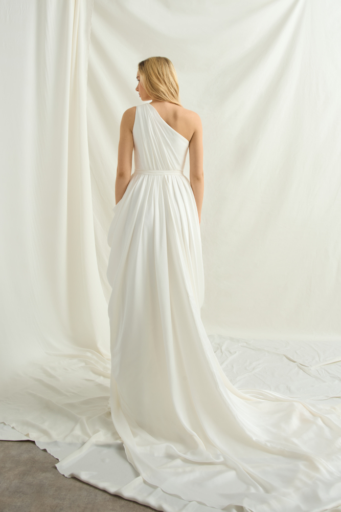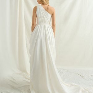 Numéro 11 est une robe de mariée asymétrique drapée. D'un style très vestale, cette robe de mariée originale conviendra à une mariée audacieuse.
