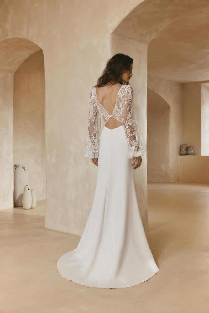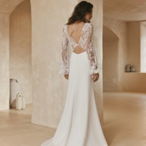 by Anna KaraOdette est une robe de mariée fourreau à manches longues. Le corsage décolleté V en dentelle mettra particulièrement en valeur la poitrine. Des manches longues bouffantes habillent les bras. Le dos ouvert à la façon d'un papillon est ultra féminin. La jupe fourreau en crêpe est fendue et allonge la silhouette.