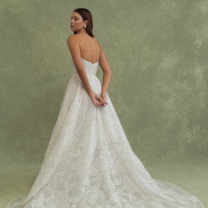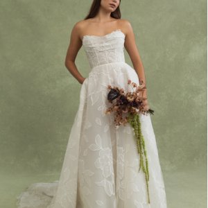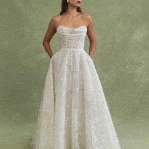 Lorelai est une robe de mariée bustier en organza brodé. Le bustier est drapé et structuré, la taille est marquée. La jupe ample et légère allonge la silhouette.
