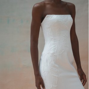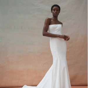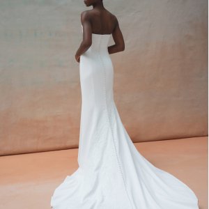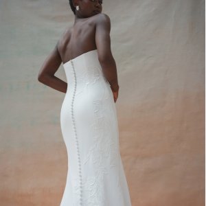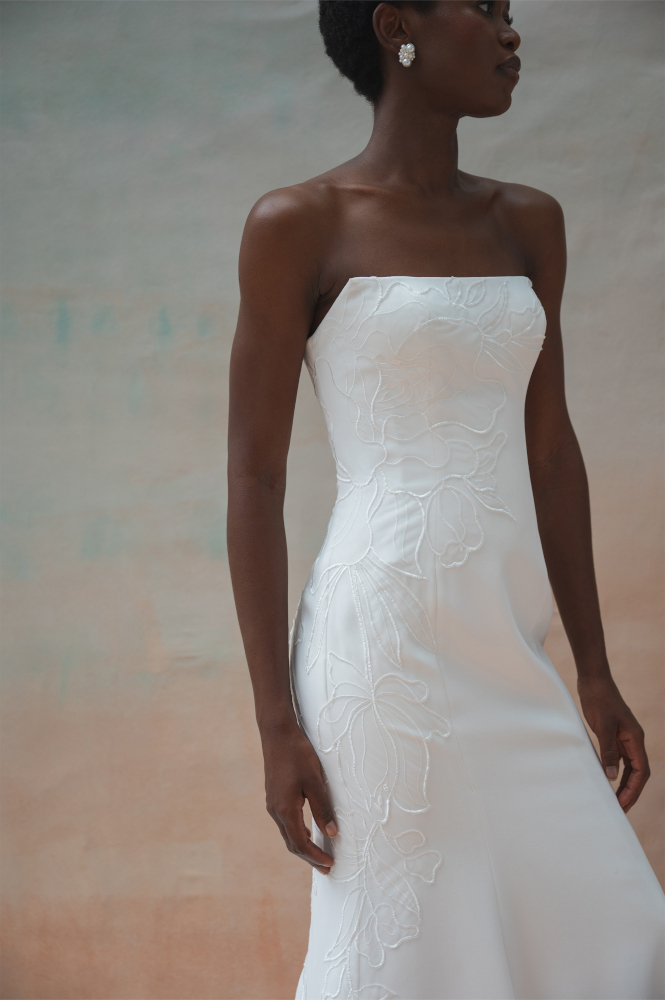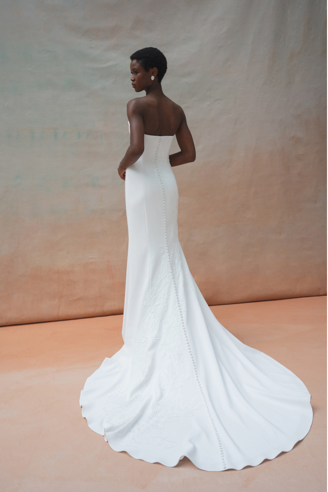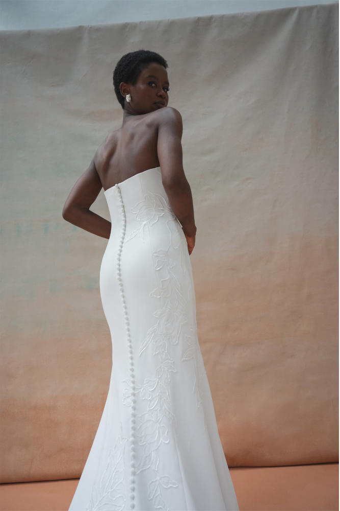 Tricia est une robe bustier fourreau en crêpe. Une application de broderie en dentelle est en option sur la robe. Le dos entièrement boutonné se termine en une longue traine.