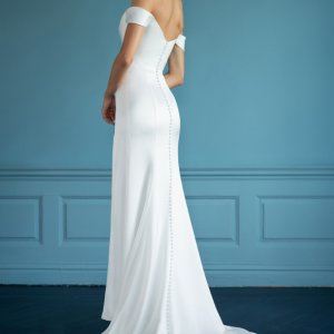 by Jenny YooViviana est une robe bustier fourreau en satin. Le bustier légèrement drapé marque la taille et s'accompagne de petites manches tombantes sur les bras. La jupe fendue allonge la silhouette. Cette robe glamour et sophistiquée conviendra à de nombreuses silhouettes.