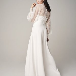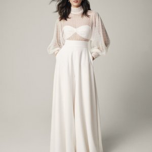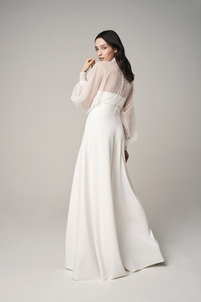 by Jesus PeiroL'ensemble Marlène se compose d'un body en tulle plumetis à manches amples resserrées aux poignets qui se porte sur un bandeau de poitrine en crèpe, et d'une jupe culotte en crèpe lourd à taille haute.