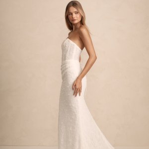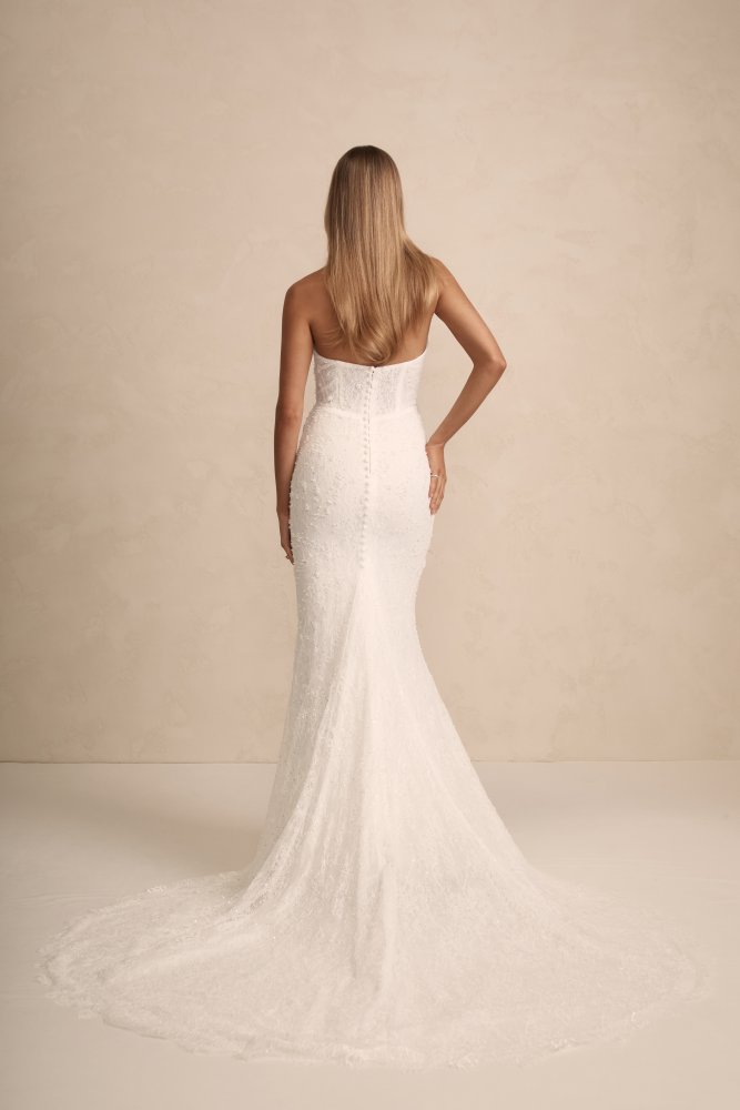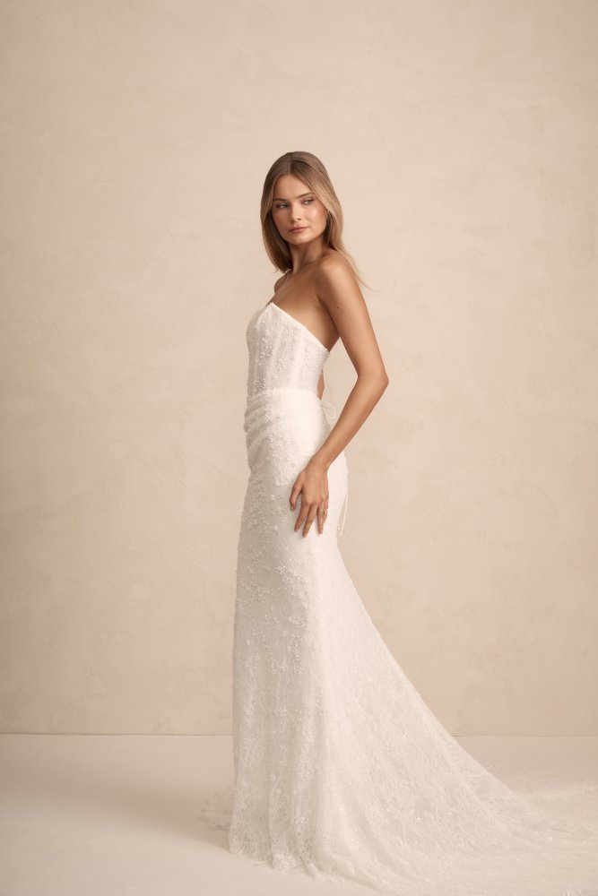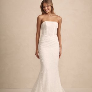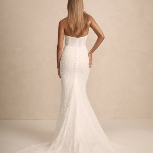 Haven est une robe de mariée sirène bustier en dentelle brodée. Le bustier droit conviendra à toutes les poitrines. La jupe est légèrement drapée sur le ventre. Le dos boutonné se termine en une élégante traine.