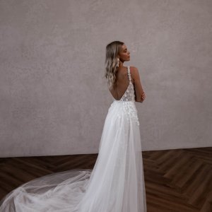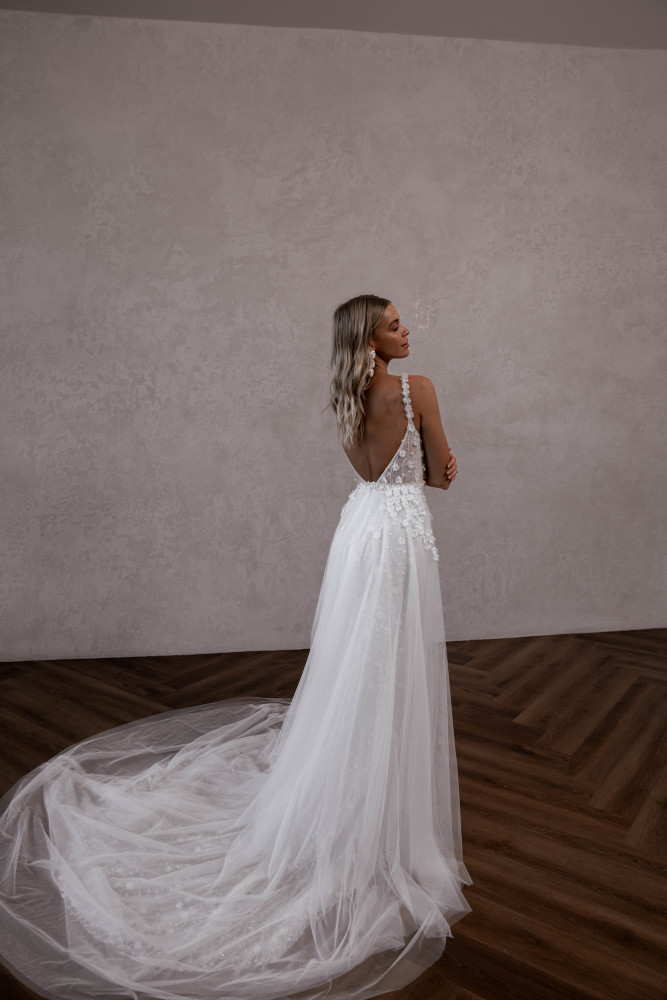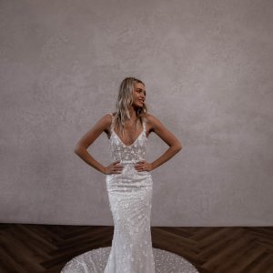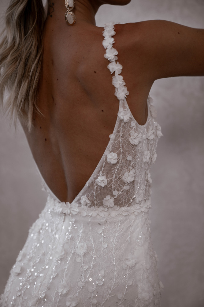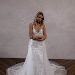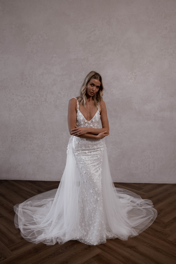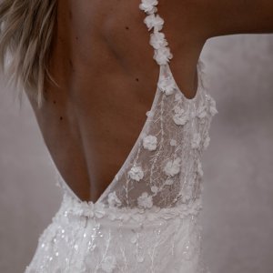 by Made With LoveLenni est une robe de mariée sirène à fines bretelles. Décolletée V devant et dos, elle met le buste en valeur. Une ceinture brodée vient souligner la taille. La jupe entièrement rebrodé de dentelle et sequins sublimera la mariée. Une jupe en tulle amovible brodée de quelques pétales est proposé en option.