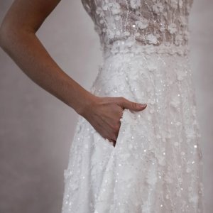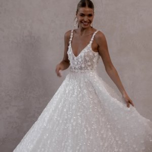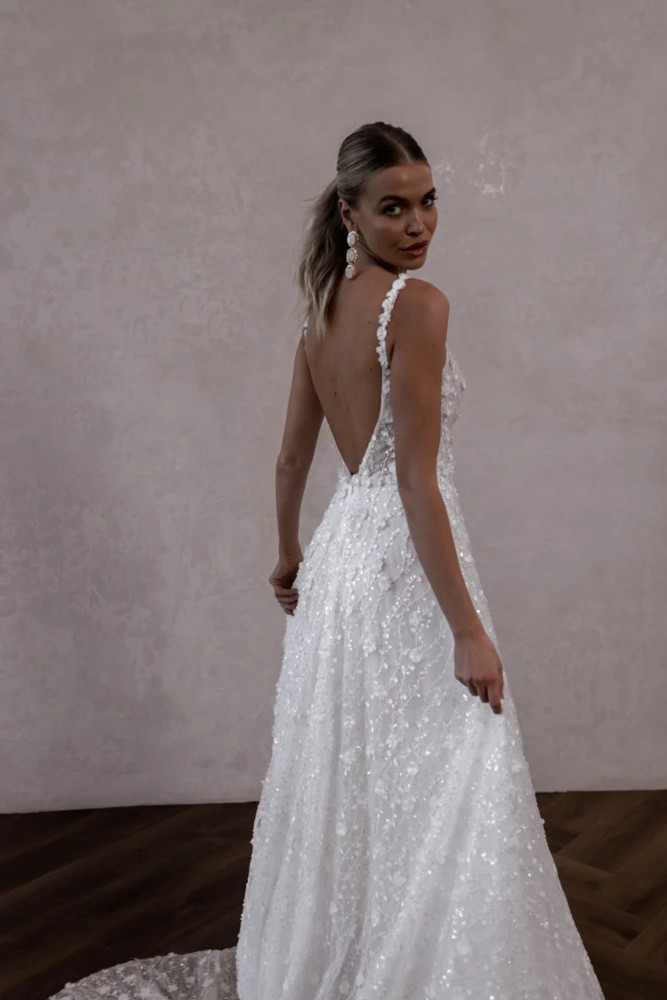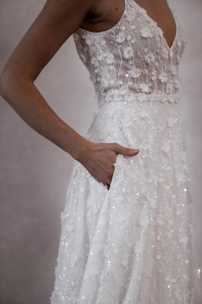 by Made With LoveLennie flowy est une robe de mariée à fines bretelles. Entièrement rebrodée de perles, cette robe de mariée romantique conviendra à de nombreuses silhouettes. Son décolleté V légèrement arrondi devant met en valeur la poitrine. La jupe évasée et légère la rend aussi romantique que moderne.