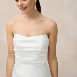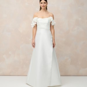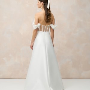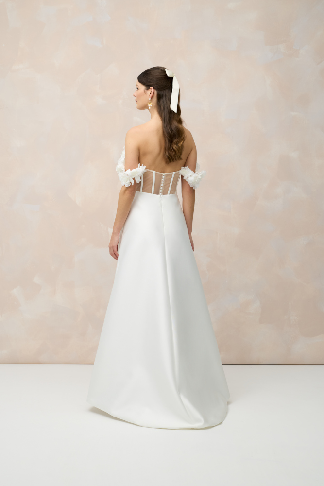 Aura est une robe de mariée bustier simple en mikado. Le bustier droit est drapé. Le dos transparent peut être proposé opaque. Des manches amovibles fleuries habillent les bras.