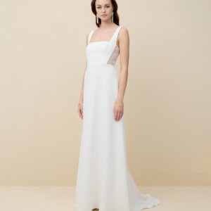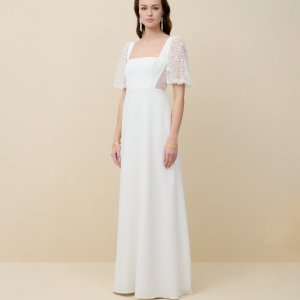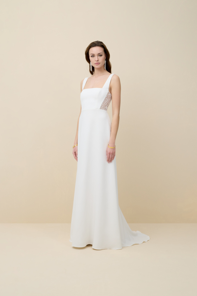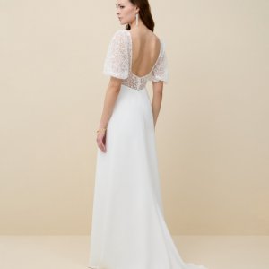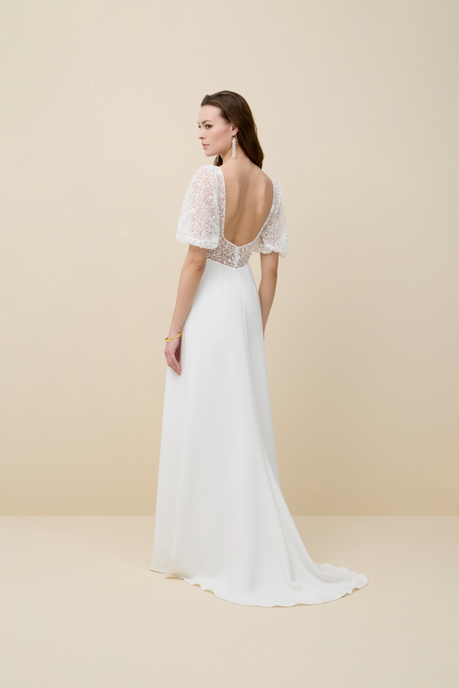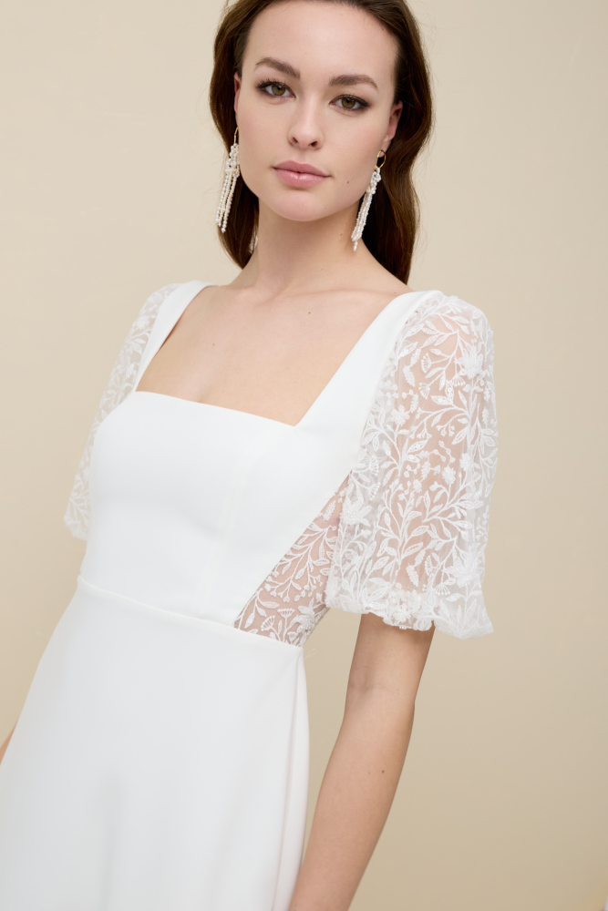 by Rembo – MarylisePerfect est une robe de mariée à encolure carrée en crêpe. Le décolleté conviendra aux poitrines généreuses. Le dos est habillé de dentelle. Des manches bouffantes en dentelle amovible habillent les bras. La jupe en crêpe allonge la silhouette.