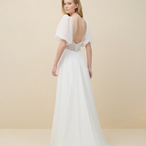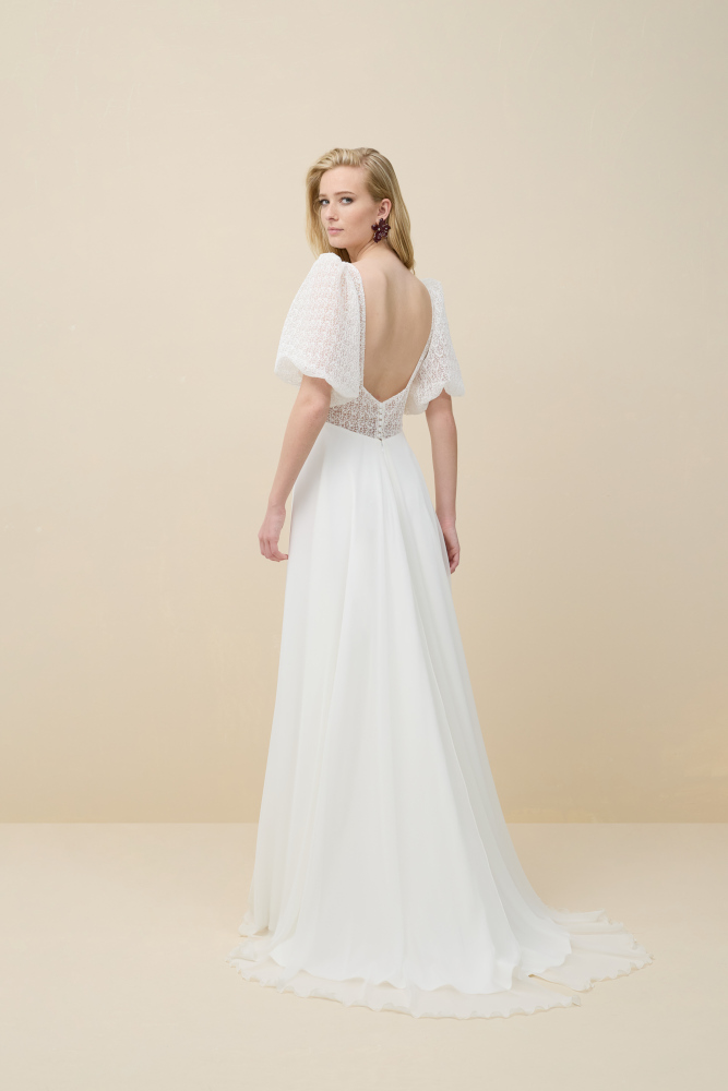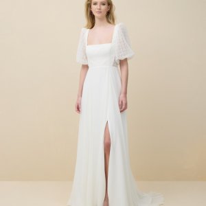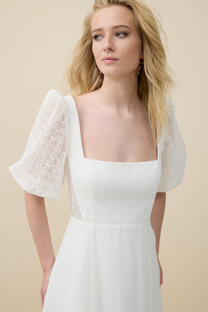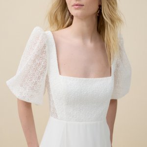 by Rembo – MarylisePerfectly est une robe de mariée à encolure carrée et manches bouffantes. Le corsage en tulle brodé moderne mettra en valeur les poitrines généreuses et le port de tête. La jupe en crêpe et mousseline fendue allonge la silhouette.