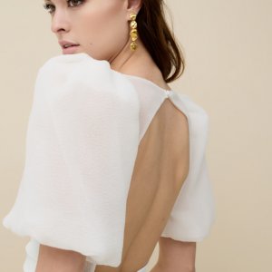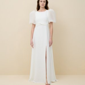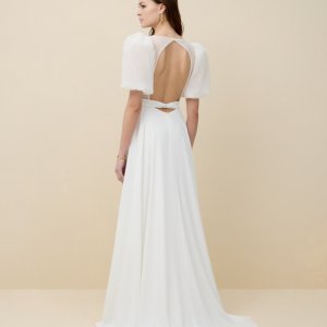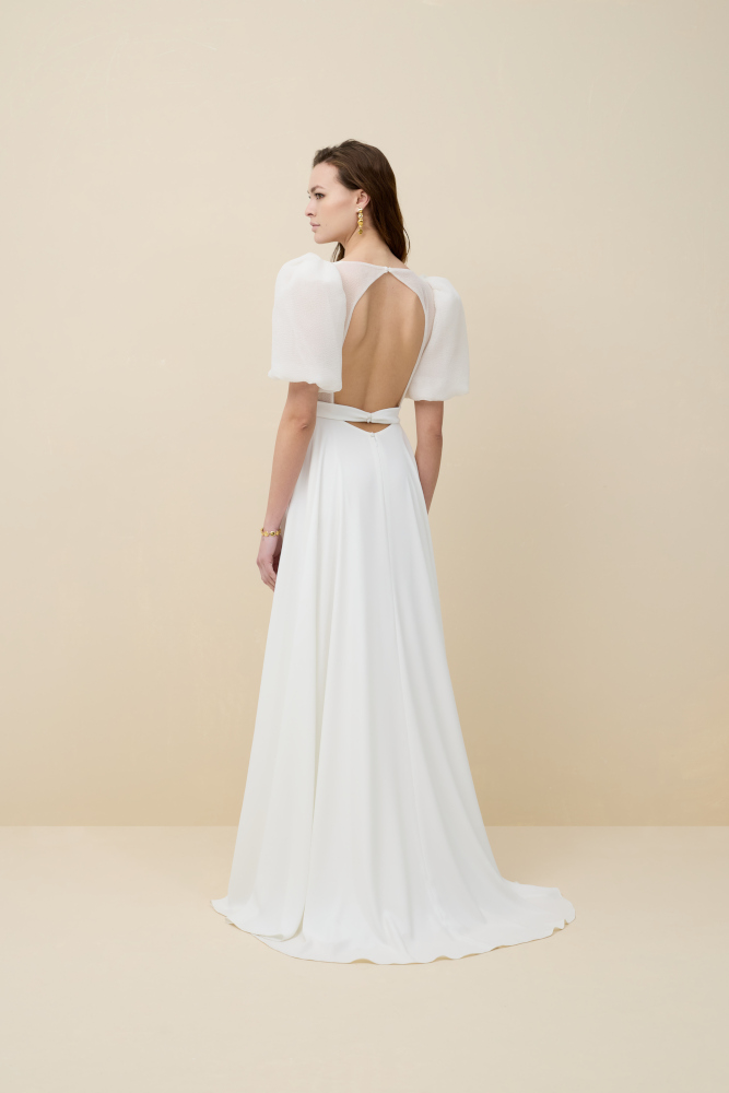 by Rembo – MarylisePromise est une robe de mariée à encolure fermée et manches bouffantes. cette robe de mariée en crêpe léger est fluide et structurée à la fois. Son col légèrement bateau allonge le buste. Des manches très bouffantes en organza gaufré habillent le hait des bras. La taille est marquée par une ceinture de crêpe torsadé. La jupe est fendue pour une allure féminine. Le dos nu vertigineux est en forme de grande goutte pour un look très glamour. Une traine allonge la silhouette.