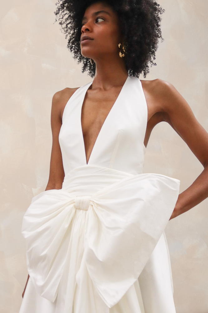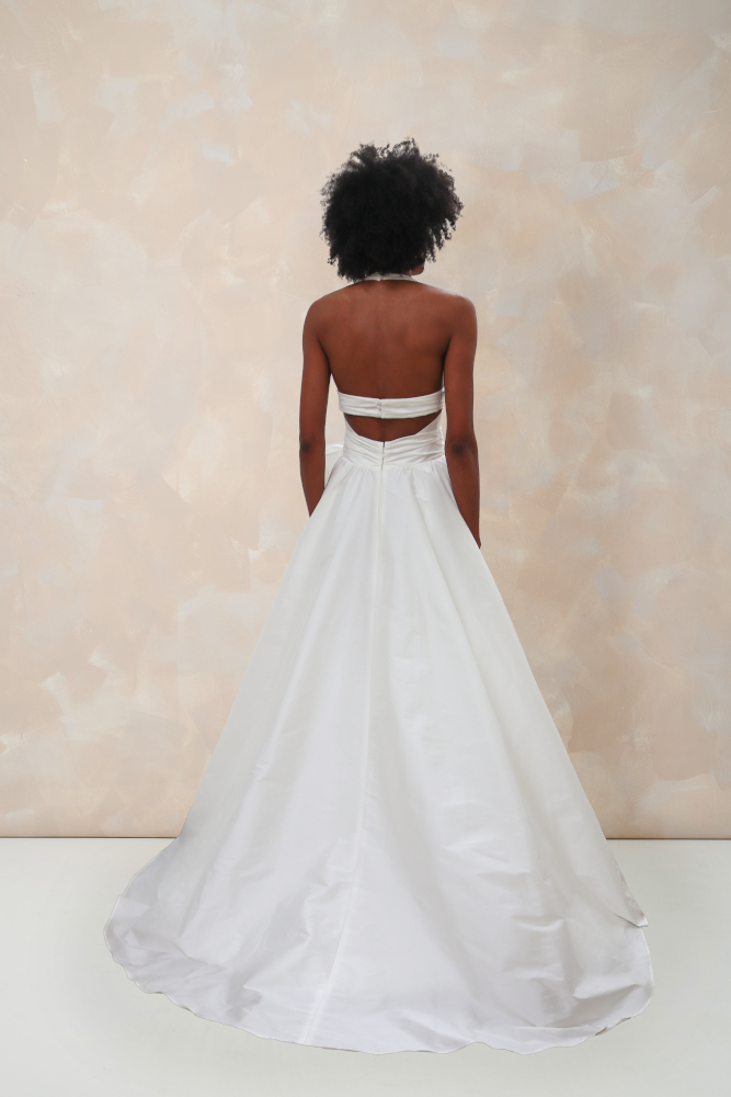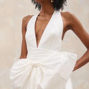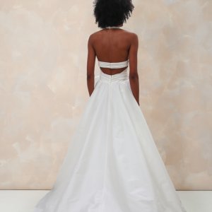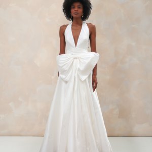 by Rembo – MaryliseShe Loves You est une robe de mariée à encolure américaine en taffetas. Le corsage profondément décolleté mettra en valeur les petites poitrines. La taille est marquée par une large ceinture de taffetas drapé. Un ample nœud amovible habille le devant de la robe. Le dos nu se termine en une traine légère.
