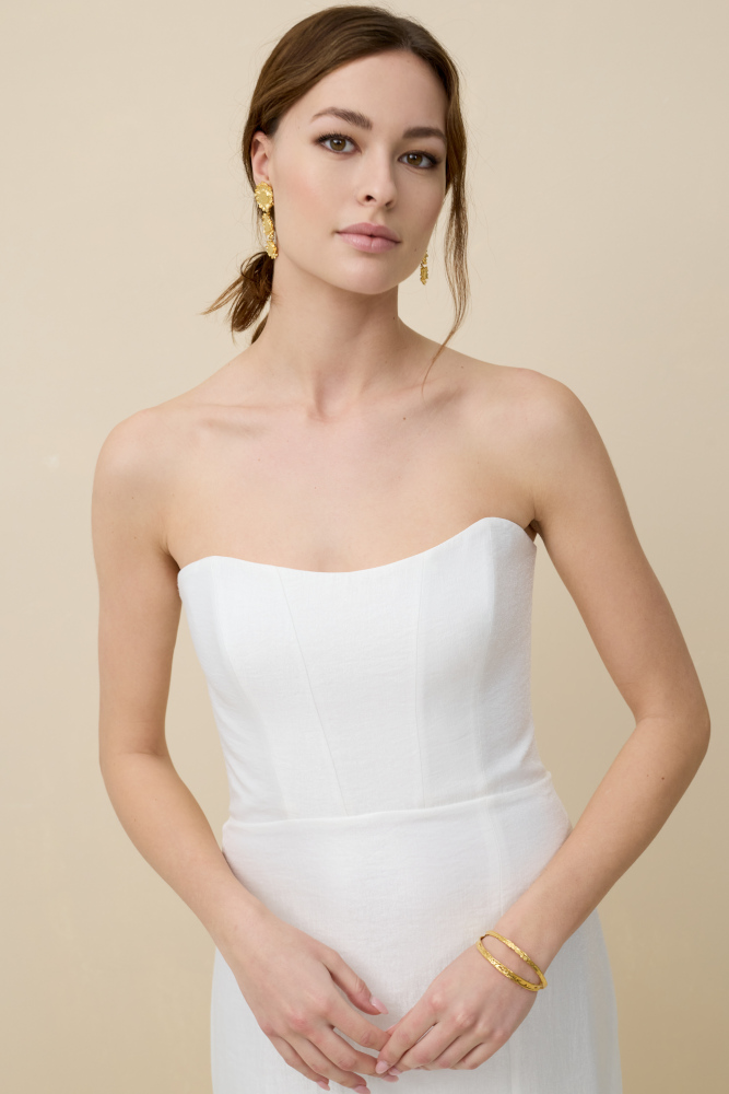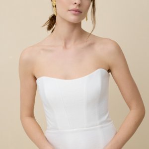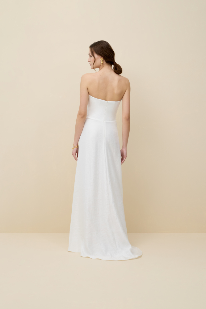 by Rembo – MaryliseTulipe est une robe de mariée bustier très simple en crêpe. Le bustier mettra en valeur le port de tête et la jupe fourreau fendue allongera la silhouette. Cette robe de mariée simplissime et élégante pourra vous être proposée accompagnée d'une cape ou d'un manteau de dentelle.