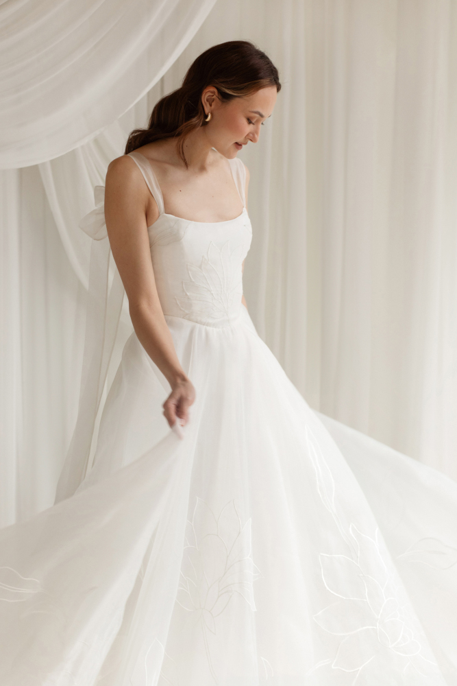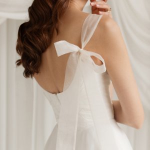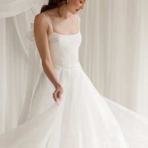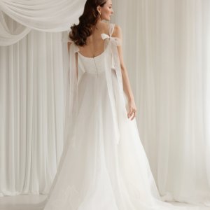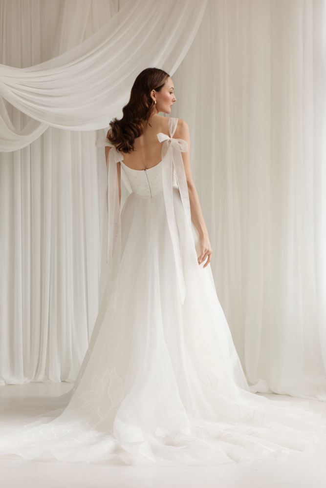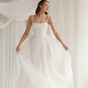 by TruvelleAssel est une robe de mariée à encolure carrée en organza brodé. Le buste très ajusté marque la taille. Des bretelles en organza se nouent dans le dos. Une jupe ample et à longue traine allonge la silhouette. Cette robe de mariée conviendra à de nombreuses silhouettes.