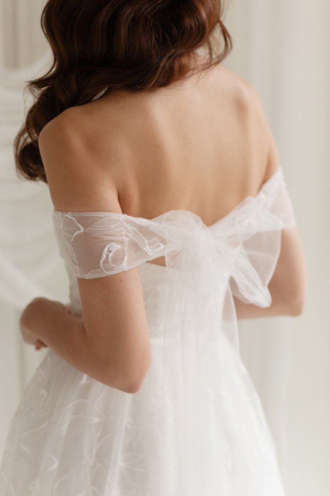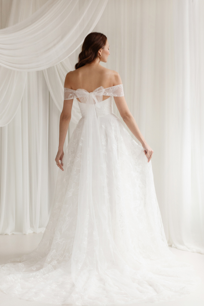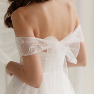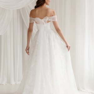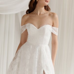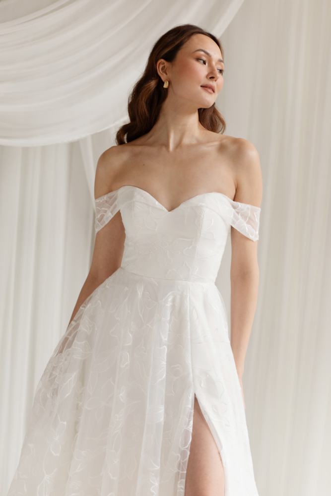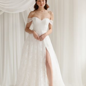 Danielle est une robe de mariée bustier en tulle brodé. Des manches amovibles et tombantes habillent le décolleté et les bras. Une jupe fluide et fendue allonge la silhouette.
