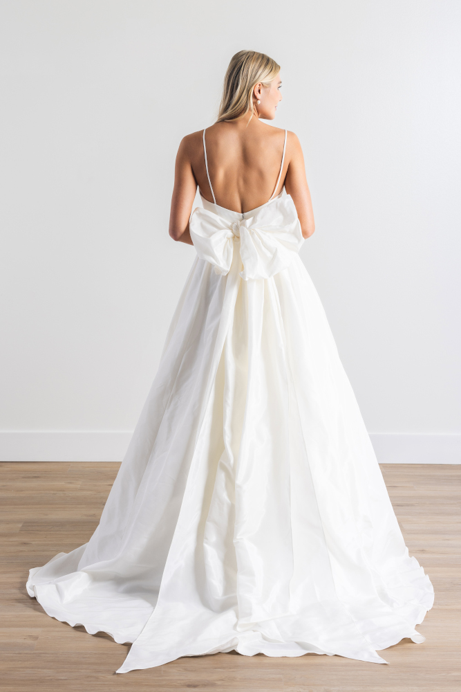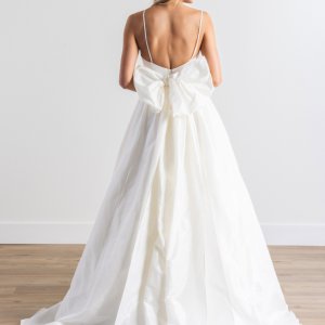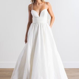 by WattersSapphie est une robe de mariée à fines bretelles en taffetas. Son décolleté coeur mettra en valeur la poitrine. La taille est soulignée par une large ceinture plissée qui se termine par un nœud dans le dos. La jupe volumineuse et légère sublime la silhouette.